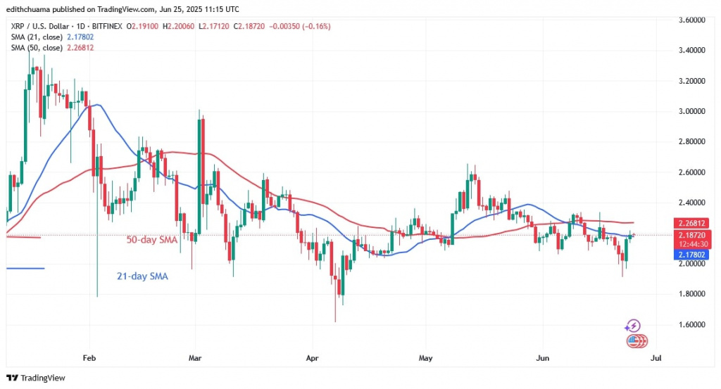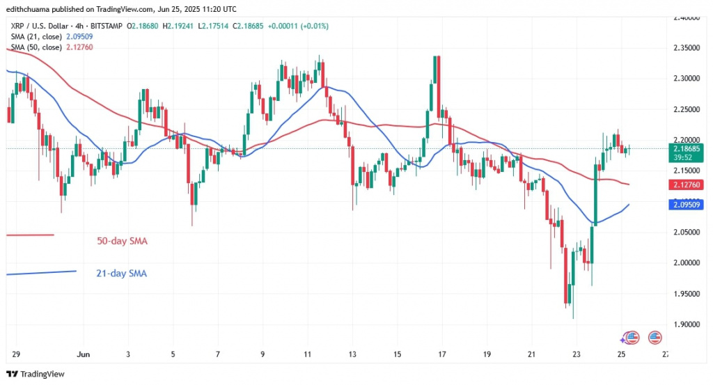 The price action has been contained above the $2.00 support and below the moving average lines. XRP is trading below the $2.20 level.