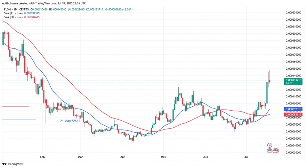 FLOKI (FLOKI) price are rising from the chart low of $0.00006322 to the high of $0.00014806. The altcoin is recovering while remaining in a sideways trend. The cryptocurrency is trading between the support of $0.00006000 and the high of $0.0002800. There are extended candlesticks above the resistance level of $0.0002800. The candlesticks show strong selling pressure at higher price levels and the presence of sellers at the recent high. Once buyers break the $0.00028000 level, the altcoin's uptrend will resume.