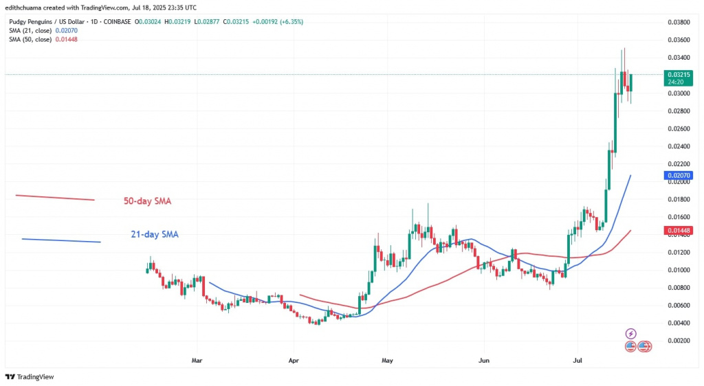 The price of Pudgy Penguins (PENGU) is on a steady uptrend and has moved significantly higher. The altcoin rose from a low of $0.013 to a high of $0.035. The upward momentum has stalled below the high of $0.035.