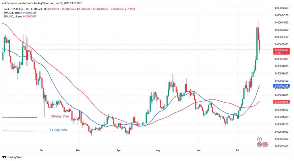 BONK's current price range is between $0.00001000 and $0.0004000, with extended candle wicks signalling the presence of sellers at higher price points. The altcoin will continue to trend until the bulls break through $0.0004000 and maintain their upward momentum.